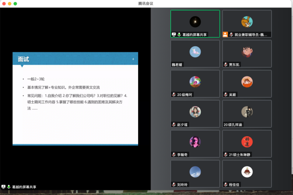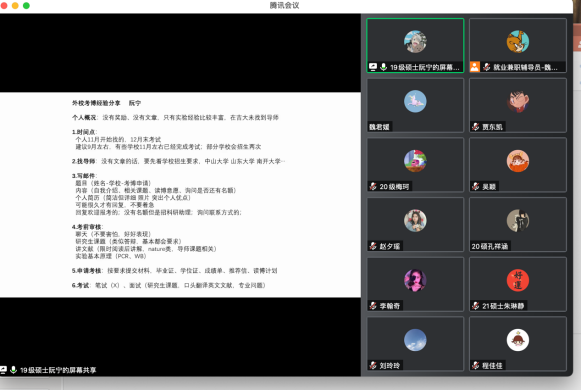 会上五位优秀研究生代表分别从升学、公考、企业、医疗事业单位四个方面为同学们带来干货满满的就业分享。考取山东大学博士的阮宁从个人概况、考博时间、选导师、考试形式等方面为大家分享了考博经验;签约江西定向选调的刘玲玲从选调生政策了解、招考一般流程、考试科目及成绩核算、笔试行测备考、笔试申论备考、面试备考等方面为大家分享了公招考试经验;签约著名药企药明康德的葛越从获取招聘信息、投递意向岗位、面试等方面为大家分享了入职公司的经验;入职西安交通大学第一附属医院的唐榕从信息获取途径、考核内容方面为大家分享了医院招聘的经验;签约黑龙江定向选调省直岗位以及济南某三甲医院的成人网站