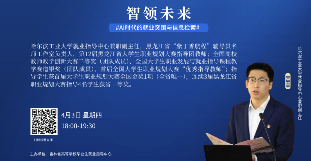 于2025年4月3日组织全体研究生线上观看了吉林省“AI赋能高校大学生重点群体就业系列直播课”首讲课程——“智领未来:AI时代的就业突围与信息检索”。本次活动旨在通过人工智能技术的前沿视角,助力医学研究生精准把握职业信息、提升就业竞争力,为医学研究生毕业生在AI时代下的职业发展注入新动能。