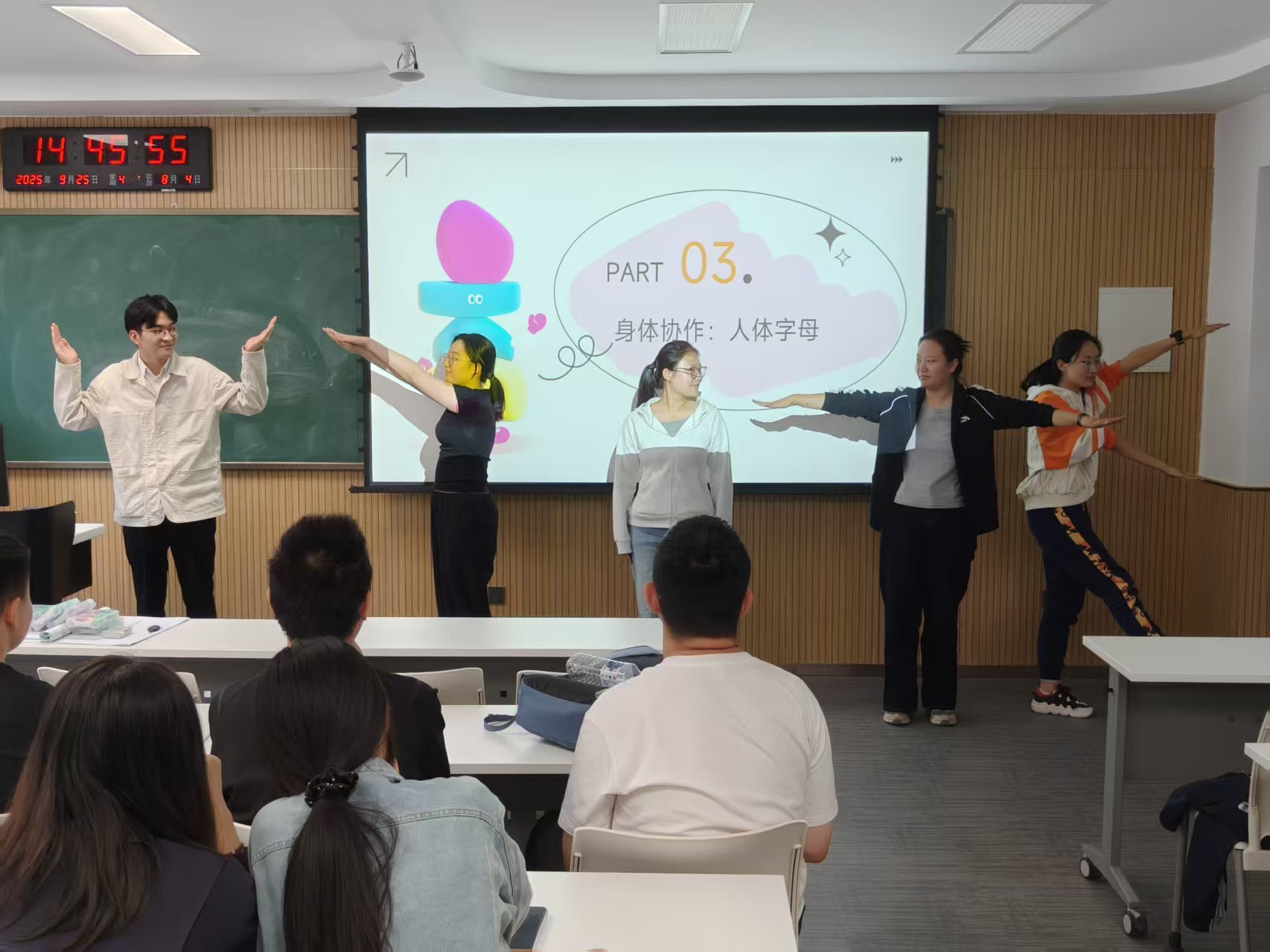 活动伊始,“一分钟鼓掌” 游戏拉开了序幕。在朋辈心理辅导员的引导下,新生们先预估自己一分钟内能够鼓掌的次数,随后全身心投入到鼓掌环节中,也以一种充满激情的方式迅速融入了活动氛围。接下来的活动则是充满了趣味与挑战的团体游戏环节,包括“我知道” 自我介绍环节,“人体字母”、“众志成城” 等团队协作环节,以及“快乐传递”、“我爱我班”、“绘制团体树”、“相亲相爱一家人”等走心互动环节。通过游戏的进行,同学们不断熟悉彼此、发现彼此的闪光点,活动现场的氛围不断被带动、被点燃。