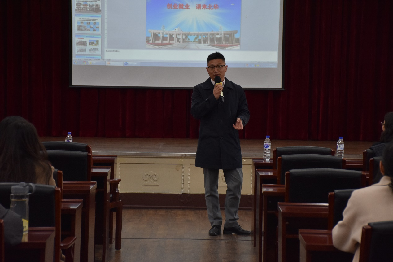 院长李咏梅,通过播放宣传片、PPT展示等方式向同学们介绍北华大学的概况、职业发展方向、人员需求以及选择该单位的理由等几个方面向同学们做了详细的介绍,并现场解答同学们的疑问。最后北华大学成人网站