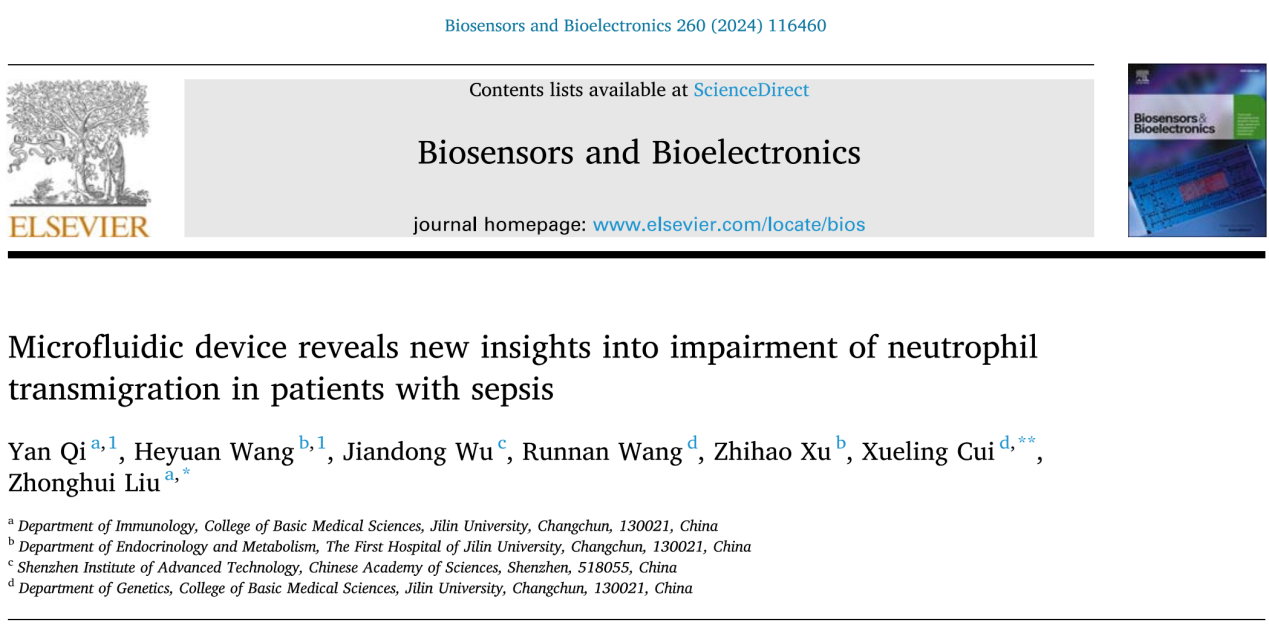 我院免疫学系柳忠辉教授团队于2024年6月1日在国际高影响力刊物《BIOSENSORS & BIOELECTRONICS》上发表了题为“Microfluidic device reveals new insights into impairment of neutrophil transmigration in patients with sepsis”的学术论文。该期刊是生物物理学领域的国际顶尖学术期刊之一,中科院分区为1区,影响因子为10.7。《BIOSENSORS & BIOELECTRONICS》杂志在生物物理学领域和分析化学和电化学领域所有期刊中分别排名第2和第3位,具有很高的学科影响力。齐妍副教授为第一作者、柳忠辉教授及崔雪玲教授共同通讯作者,成人网站