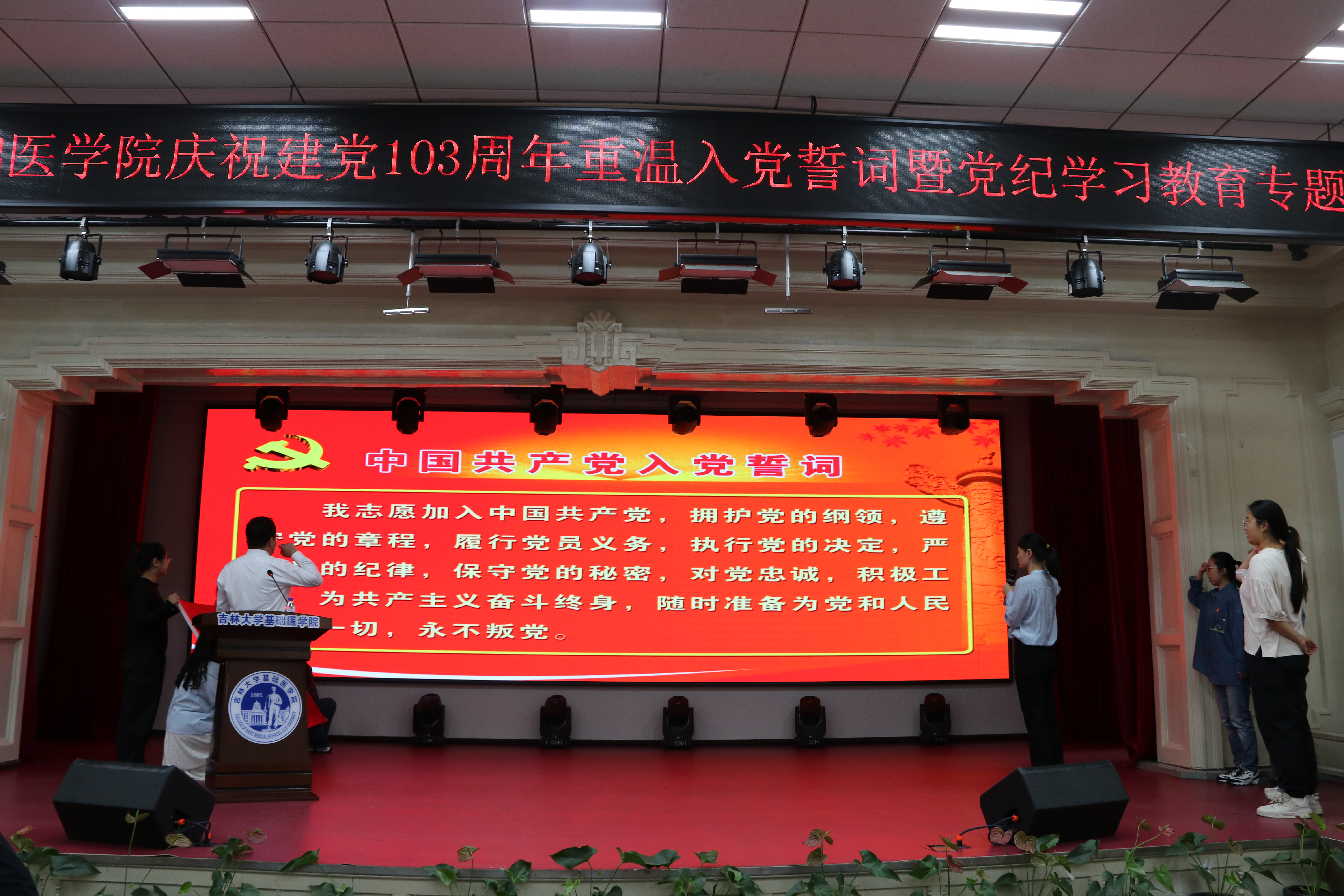 首先,党委办公室主任夏燕来同志领誓,所有党员及其新入党的预备党员进行了入党宣誓。随后,新入党党员代表何侃、入党积极分子代表杨晓濛分别上台发言。