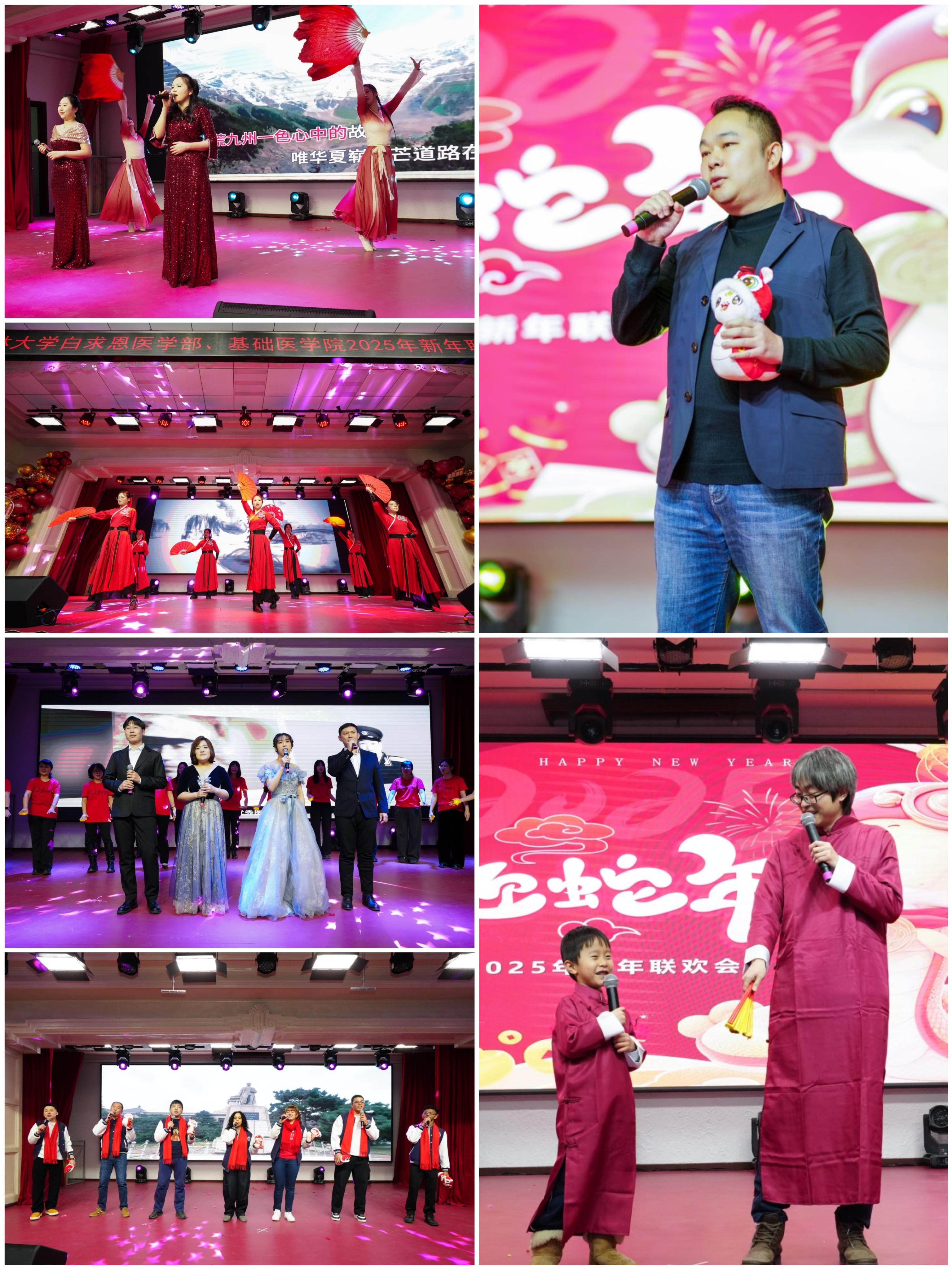 联欢会在长春市第一实验银河小学星星合唱班孩子们演唱的一曲《爱漫天空》中拉开序幕,优美的童声仿佛带我们进入了梦幻的世界;教职工第一党支部带来的扇子舞《雪龙吟》,将中华古典舞蹈完美的呈现,让我们领略了老师们的风采与活力;白求恩医学部王曦老师带来的独唱《木鱼与金鱼》,让现场观众深深沉浸在歌曲的旋律与情感之中;王放院长与智加未来、华为两位企业嘉宾合唱歌曲《跟往事干杯》,用歌声对过去致敬,同未来举杯,将现场气氛推向了新的高潮;组织学与胚胎学系带来的小合唱《财神快点来》,免疫学系、细胞遗传学系以及实验教学中心三综合带来的小合唱《一路生花》让我们感受到了浓浓的喜庆与祝福;丁健峰老师和他可爱的儿子表演的相声《说好不说好》让现场欢声笑语不断;来自吉林省艺术学院的实力唱将刘华晨老师演唱的歌曲《日落大道》和《男孩》,惊艳全场;病理学系带来的歌伴舞《苹果香》、生理学系的歌伴舞《万疆》,生物化学学系,实验教学中心二综合及测试中心合唱的《少年的你啊》,纷纷展现了学院教职工蓬勃向上的精神面貌,赢得了阵阵喝彩;学院留学生班主任及四位留学生同学带来的歌曲《恭喜发财》,将不同文化的魅力融合在音符间;白求恩医学部张博老师带来的魔术《654俱乐部》精彩纷呈,让人眼前一亮;最后由成人网站