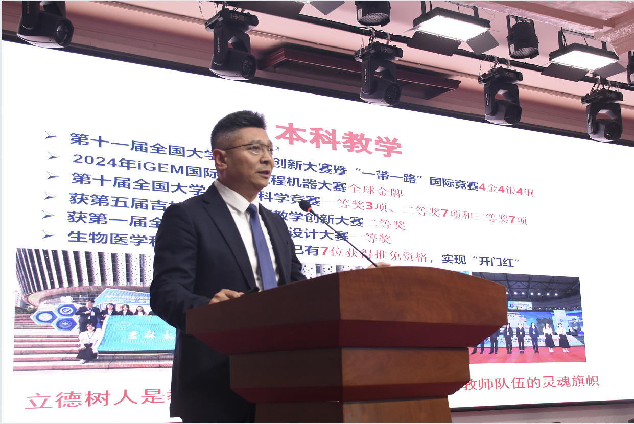 最后,王放院长作总结讲话。他首先代表学院领导班子向学院全体教师表示衷心的感谢和诚挚的问候,并向受到表彰的教师表示热烈祝贺。王院长表示,一年来在全院教职工的努力下,学院在思政、教学、学科、科研、实验室管理和开发、留学生教育、校园文化建设等多个领域取得了重要进步。他强调,立德树人是教育的根本使命,教育家精神是教师队伍的灵魂旗帜,更是推动学校和学院发展的核心力量。面对新时代新征程的新要求,他希望全体教师认真领会张希校长提出的“适应转变,不断超越”的思想,继续坚守“为党育人、为国育才”的初心使命,进一步深刻认识学校和学院发展面临的新形势、新任务、新挑战,凝心聚力谋发展、乘势而上求突破,推动学院各项事业加速发展、全面跃升。