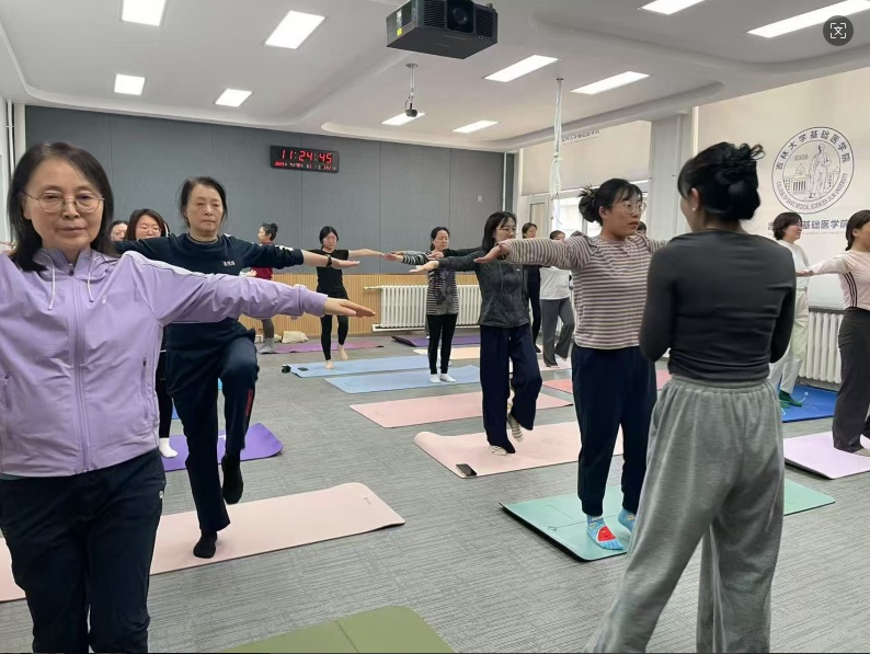 同时,为帮助女教师缓解教学、科研压力,增强身体素质,学院妇委会特别开设“优雅绽放”瑜伽训练课。课程邀请体育学院专业瑜伽导师执教,每周两次利用午间准时开展,通过系统的体式训练、呼吸调节和冥想放松,帮助教师在繁忙工作之余舒缓压力、提升状态。学院配备了专业的瑜伽砖、平衡波速球等器材,为学院女教师创造了优质的训练环境。课程开展以来,获得了参与教师的一致好评,成为学院午间一道亮丽的风景线。