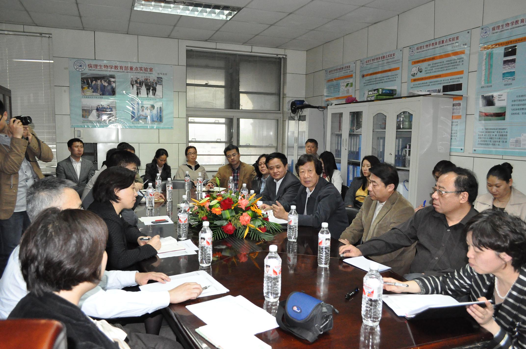 首先,白求恩医学院科研副院长陈立从科研基地、人员构成、近三年的科研情况等方面对学院的学科平台建设进行了简单介绍,提出长期存在的空间不足和硬件设施急需更新的问题,建议打破学科界限,建立医学部共享平台。李玉林从教学平台和科研平台建设等方面总结了病理生物学教育部重点实验室的现状,建议建立开放性医学共享平台、加大引进人才及人才培养力度等。孙连坤指出学院将以本次调研为契机,展示基础医学的优势,吸引各学院与基础医学合作,并提出合作模式应该多样化,共同促进医学发展。随后,病理生理学、病原生物学、免疫学、药理学学科带头人分别汇报了本学科平台建设情况。最后,王冠军对基础医学克服底子薄、设备旧等困难取得的成绩进行了充分肯定,同时表示医学部将搭建医学大平台,促进基础医学与临床医学及其他学科的交流合作。
