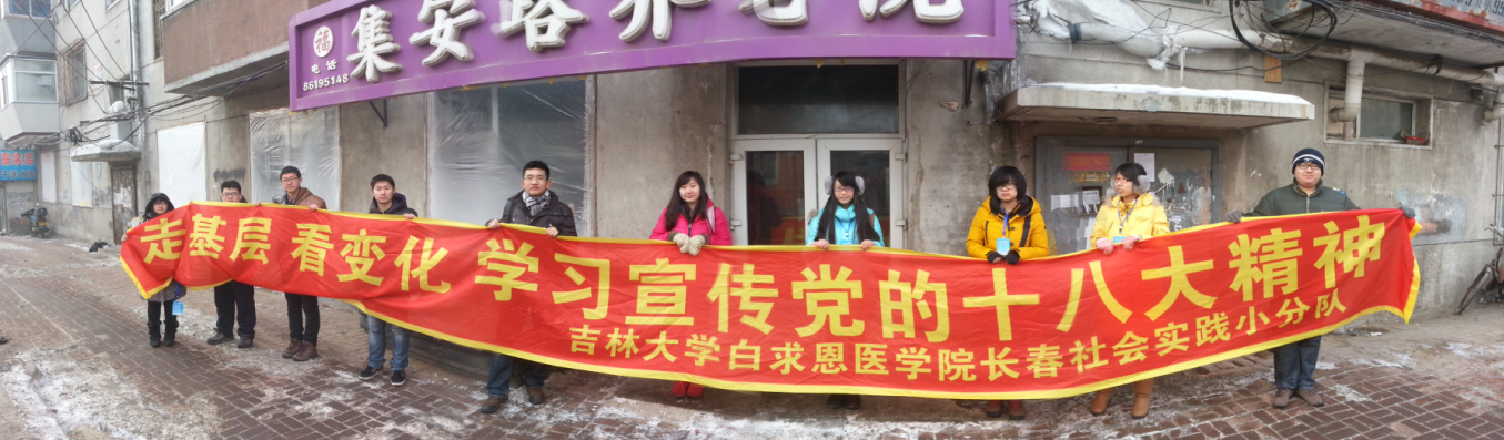 为了深入学习、贯彻党的十八大精神,增强学生的社会责任感和实践能力,白求恩医学院团委开展了2013年“走基层,看变化,学习宣传党的十八大精神”主题寒假社会实践活动,2013年1月20日,白求恩医学院医疗服务小分队开展了主题为“弘扬雷锋精神,爱心服务吉林”的社会实践活动。