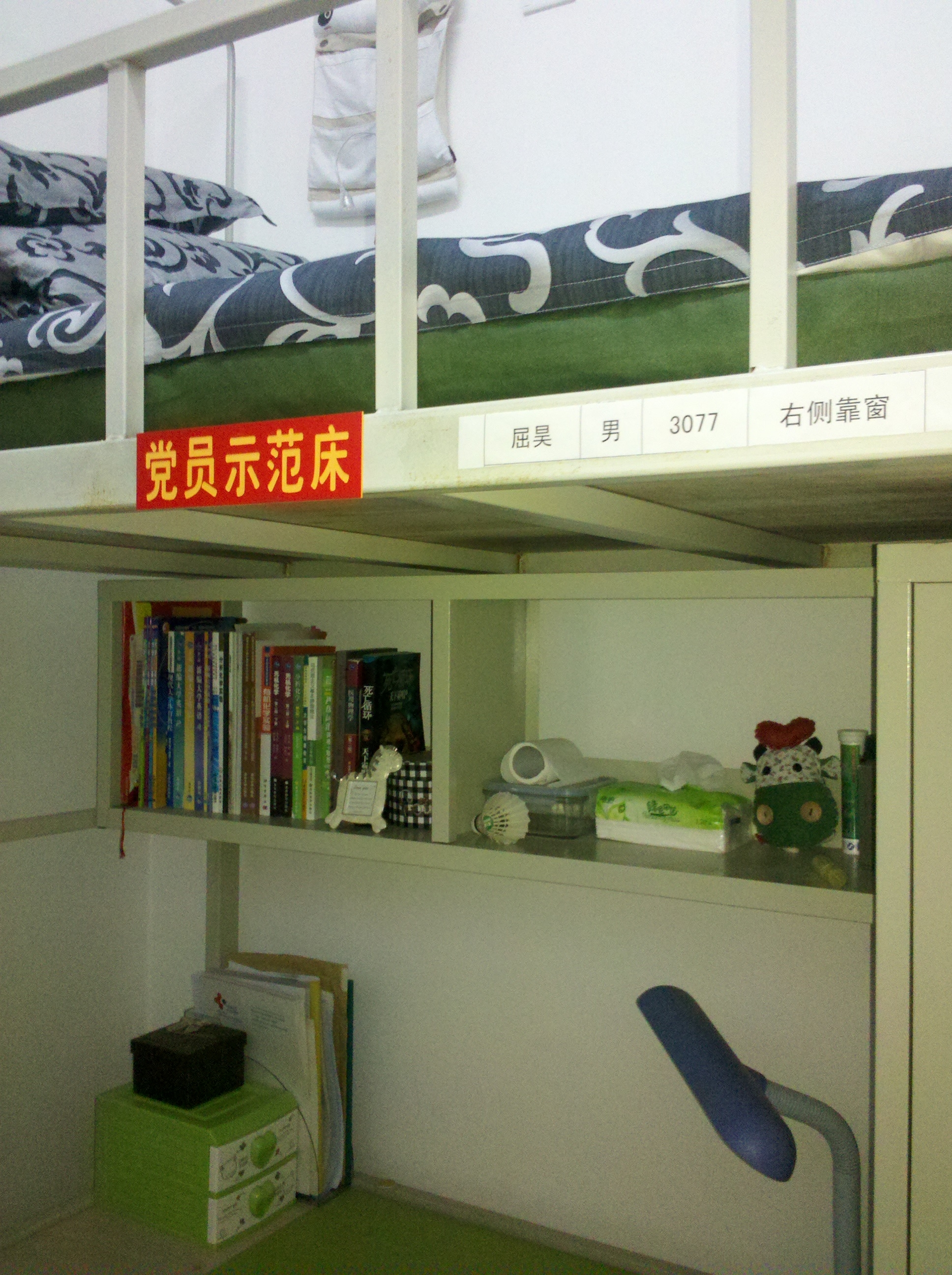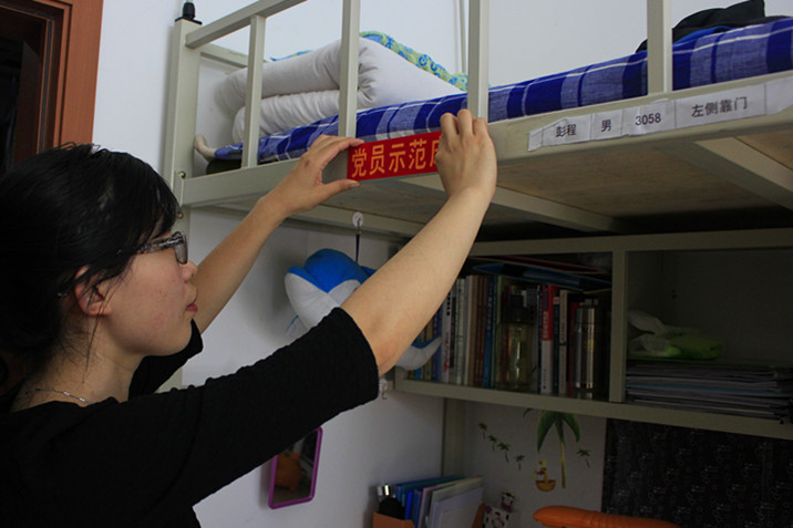 关于在创先争优活动中深入开展基层组织建设年活动的实施方案》,促进和完善学生寝室管理制度,辅导员魏宇航及学院寝室楼管理委员会部分成员于6月26日下午对基础园区一公寓11级长学制全体党员进行了党员示范床挂牌活动。