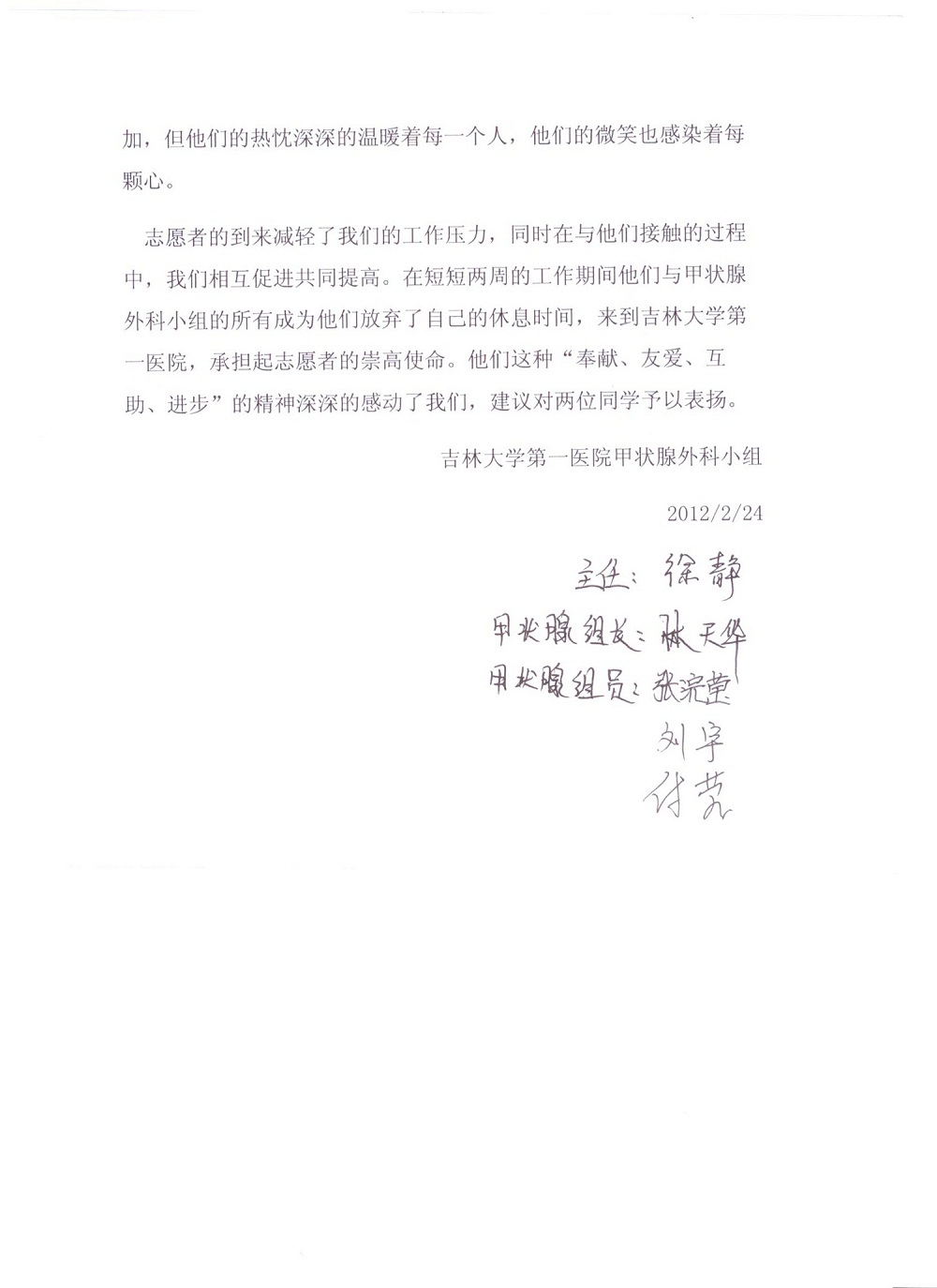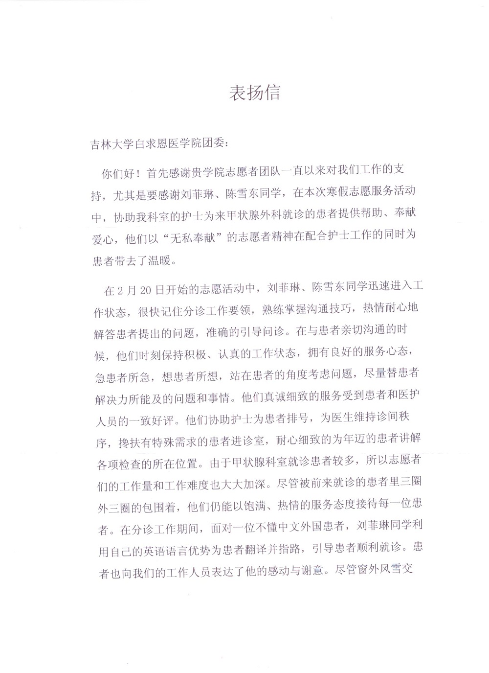 近日,白求恩医学院团委收到成人网站 第一医院甲状腺外科小组寄来的表扬信。对我院志愿者团队为成人网站 第一医院所做的志愿服务工作表示感谢,尤其是感谢701101班的刘菲琳同学和701002班的陈雪东同学,他们在寒假志愿者服务活动中协助科室护士为来甲状腺外科就诊的患者提供帮助、奉献爱心,以“无私奉献”的志愿者精神为患者带去了温暖。