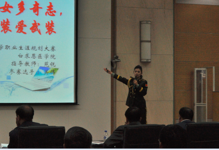 此次比赛分为书面作品展示、现场PPT展示及答辩两个环节。比赛过程中我院参赛选手各展才华、沉稳睿智,博得评委的一致好评。身为女国防生,关伟同学从自我选择、职业探索、大学规划等角度出发,对“中华儿女多奇志,不爱红装爱武装”的职业生涯规划主题进行了阐述;朱翠琳同学则以‘医者·人心’为主题,讲述了她从一名临床医学生走向心理医生的职业生涯规划过程,精彩的演讲和机智的应答博得在场观众的阵阵掌声。