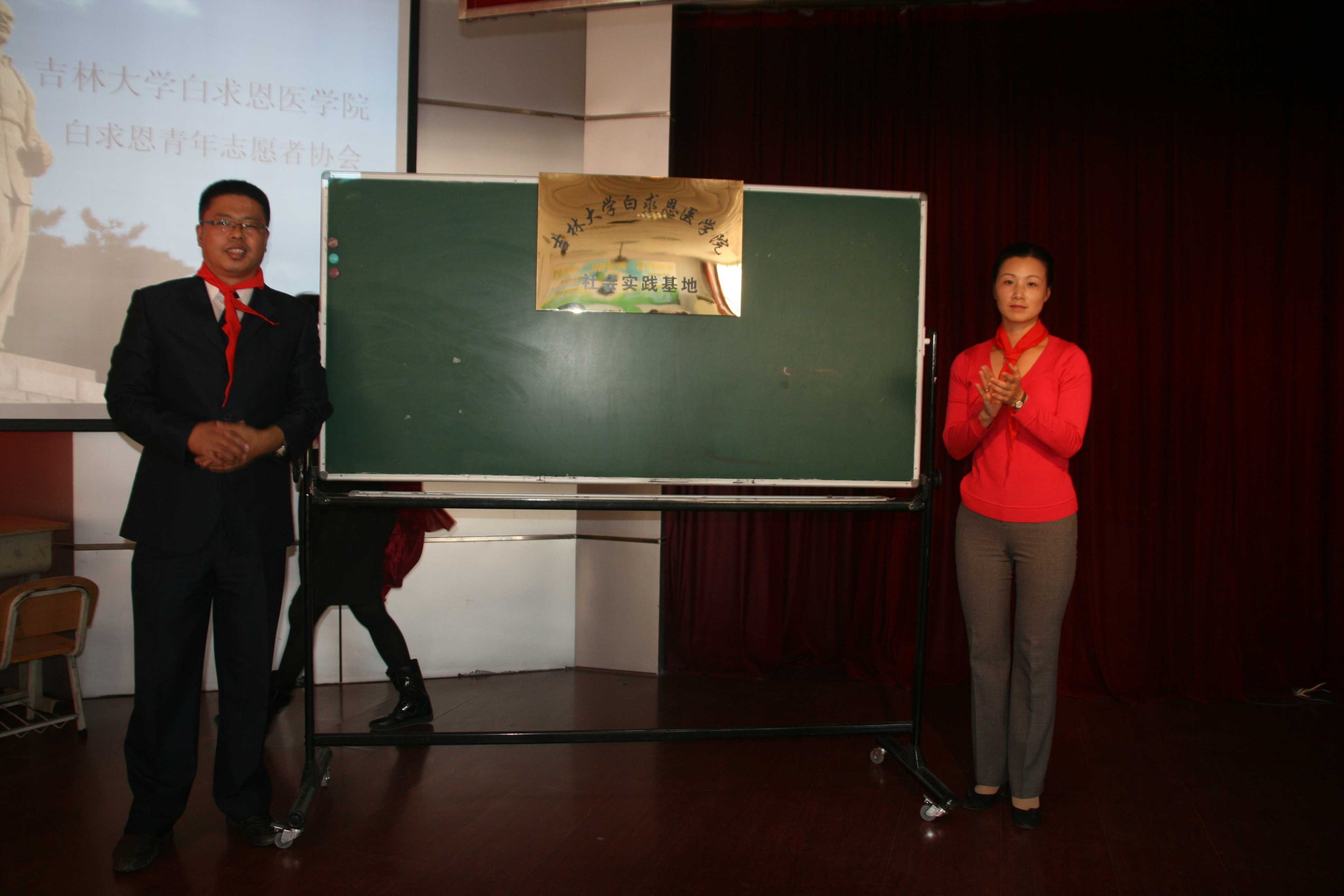 白求恩医学院社会实践基地”揭牌仪式在明德小学礼堂举行。白求恩医学院学生工作办公室主任吴剑锋、团委书记夏燕来、辅导员魏宇航以及明德路小学德育校长林可参加了此次仪式。