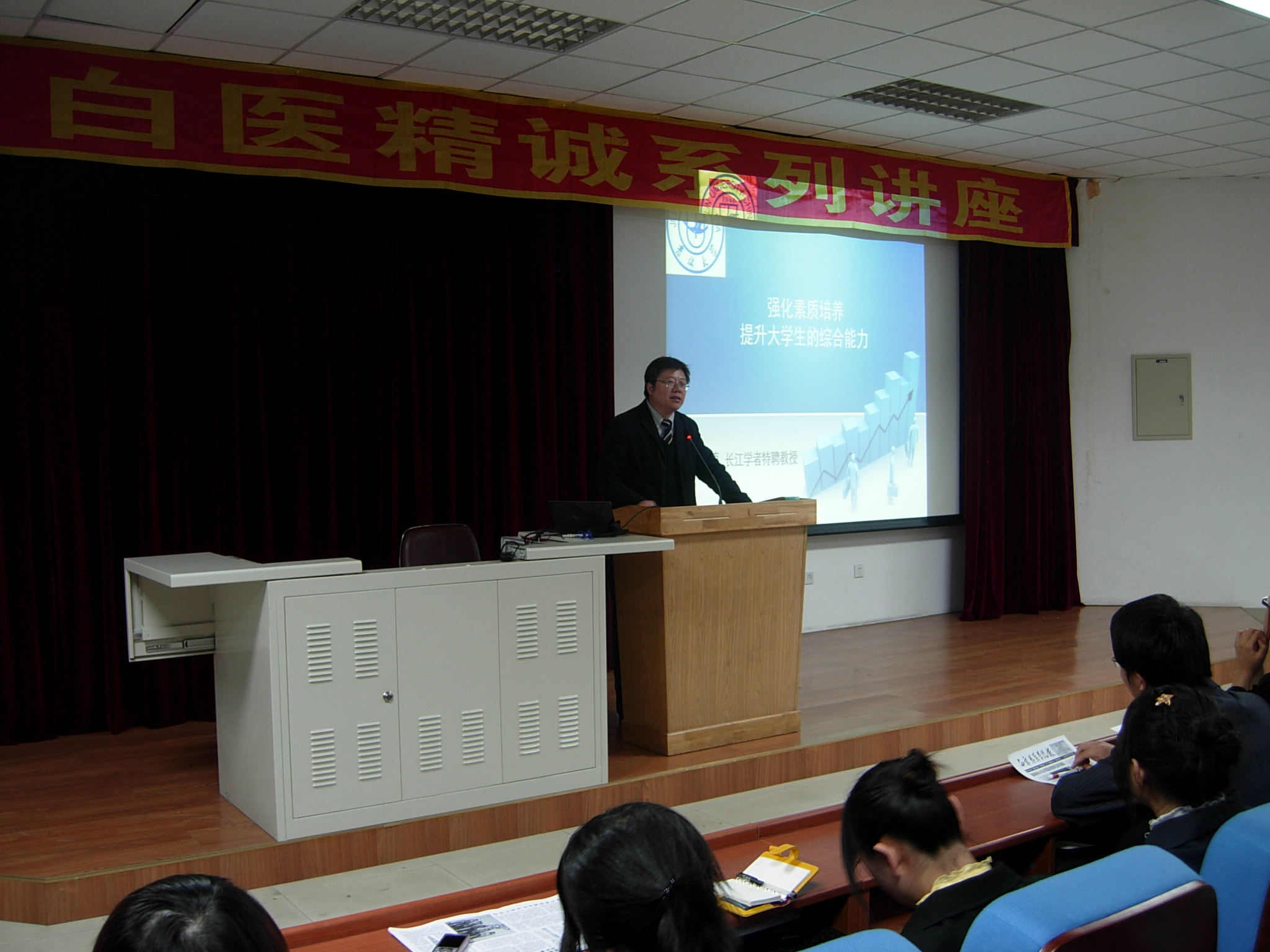 11月30日18时,白求恩医学院“白医精诚”系列讲座第一讲在新民校区第二教学楼402教室拉开帷幕,讲座邀请、白求恩医学院生物化学教研室主任李校堃为大家带来了题为“强化素质培养,提升大学生的综合能力”的精彩演讲。