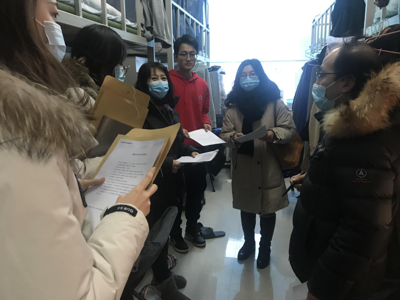 学院老师逐一进入每个宿舍,深入细致地检查每间宿舍的情况,并同住校生们进行亲切交谈,详细了解每位学生的思想动态及生活状况,督促学生一定要加强宿舍公共卫生和个人卫生,要勤洗手,戴口罩,多通风。在校期间一定要做好卫生防疫工作,减少非必要出行,时刻做好自身的安全防护,绝不能放松警惕。严格按相关规定和要求做好实验室和寝室消毒消杀工作,进一步加强和落实疫情防控期间的防疫工作。同时给每个寝室发放了《留校学生每日必做清单十一项》,督促学生严格按照上面的规定执行。