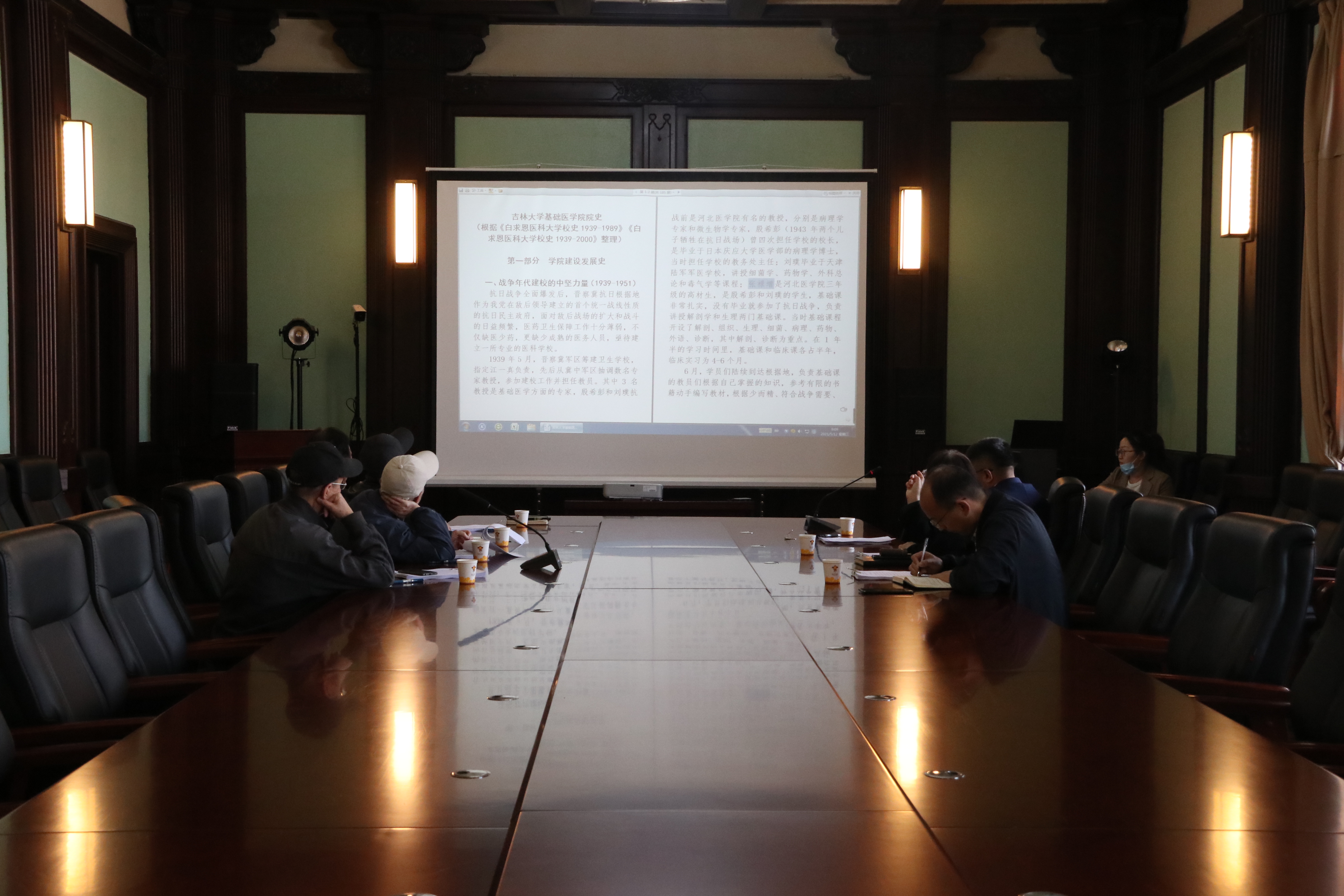 院史内容。期间,老领导们对编撰学院史工作给与充分肯定和高度评价,同时也指出部分与修正意见、建议。李玉林校长指出:应从党史学习角度完善院史编撰,并进一步挖掘老一代医学家、教育家、科学家和他们的感人事迹,更好的继承和弘扬白求恩精神;吴家祥校长指出:编撰工作既要联系实际,又要尊重历史,不能丢弃七十年来建立的奋斗精神,同时也表明梳理建校、建院的过程就是学习党史的过程;钟国赣校长指出编撰院史一定要精准写清楚各阶段历史。