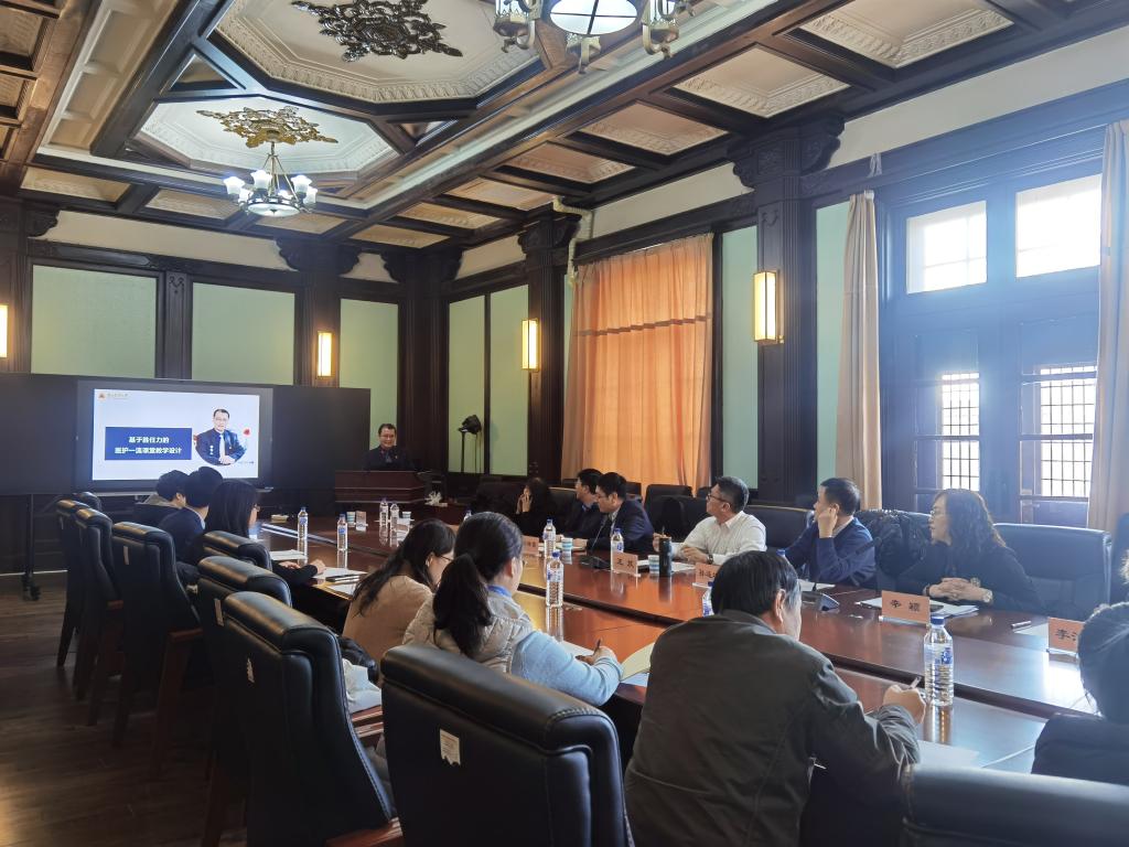 董为人教授通过创新之大变局和各项创新案例,介绍了课程思政如何润物细无声的融入到课程设计中,并对基础医学各课程与早期临床如何巧妙融合展开深度讨论。董教授指出,在课程建设方面,要有家国情怀,要学会内容创新、理念创新和模式创新;在教学设计方面,鼓励教师要学会引导学生以思维驱动学习,并要注意形成性评价效果,及时动态调整,适应学生发展;在教学内容方面,教师要充分发掘基础医学知识的特性,将疾病预防、健康指导等有机结合,真正做到医教融合。在座谈交流阶段,与会领导与教师积极发表自己的看法,并与董为人教授就“如何才能上好一门课”、“基础课程与早期临床的关系”、“整合课程如何调整优化”及“执业医师考试课程设计”等方面展开讨论与交流。