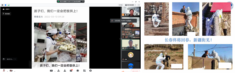 各个校区的抗疫剪影,为大家展示了吉大人用实际行动书写了吉大担当与吉大力量,鼓励同学要学会勇敢与乐观;9.法医学系授课教师为同学们播放了抗疫救治医疗队送首批治愈者回家的视频,通过视频中的蓝天、阳光和笑脸鼓励学生疫情终将被战胜;10.病原生物学系授课教师以当前的疫情形势作为切入点引入微生物学课程,并从专业的角度提醒学生注意防护,鼓励同学积极面对,提高医学生的使命感;11.遗传学系授课教师通过播放一组“夜幕下的长春”短视频,为同学们展示了镜头下安静的长春,但仍旧有抗疫工作人员的身影在忙碌,鼓励同学们不要浪费青春年华,与同学一起云端期待着早日见到长春往日的繁华景象;12. PBL教学组授课教师带领小组同学进行案例讨论,每位同学都分享了自己对抗疫的一些心得与体会,字里行间是同学对吉大 “饲养”的感谢,对教师辛勤工作的感谢,也是对抗疫工作者辛苦付出的感谢;13.病理生理学系授课教师在线为学生播放《人世间—抗议特别版》,并总结道:我们的岁月静好,正是因为这些投身抗疫工作的人们的负重前行,鼓励学生不要浪费学习的机会,要坚信“疫去春来”。