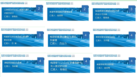 病理学系的李艳茹和吕爽分别以《以学生为中心的二维融合混合式教学设计》和《构建多元评价体系助力病理学教学改革》为题,分享了混合式教学模式以及形成性评价的实施经验。