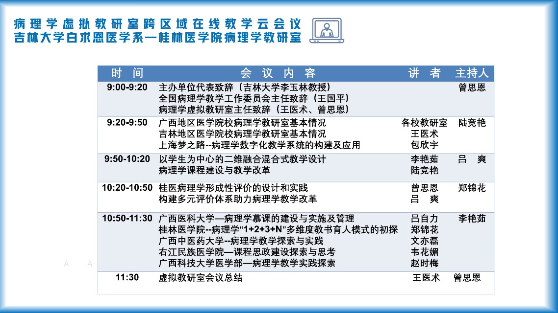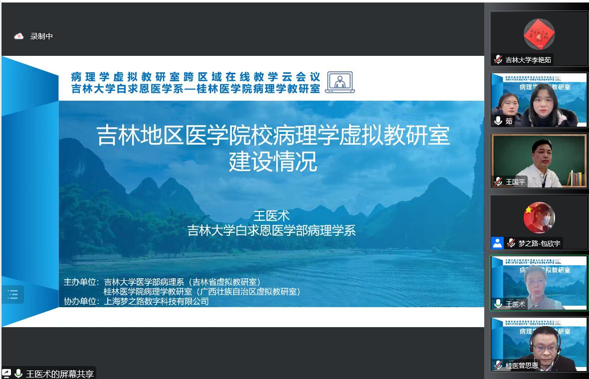 病理学系和桂林医学院病理学教研室两所省级虚拟病理学教研室共同主办以及上海梦之路数字科技有限公司协办,联合吉林广西医学高校病理学教研室共同参加的跨区域在线云备课正式开启。