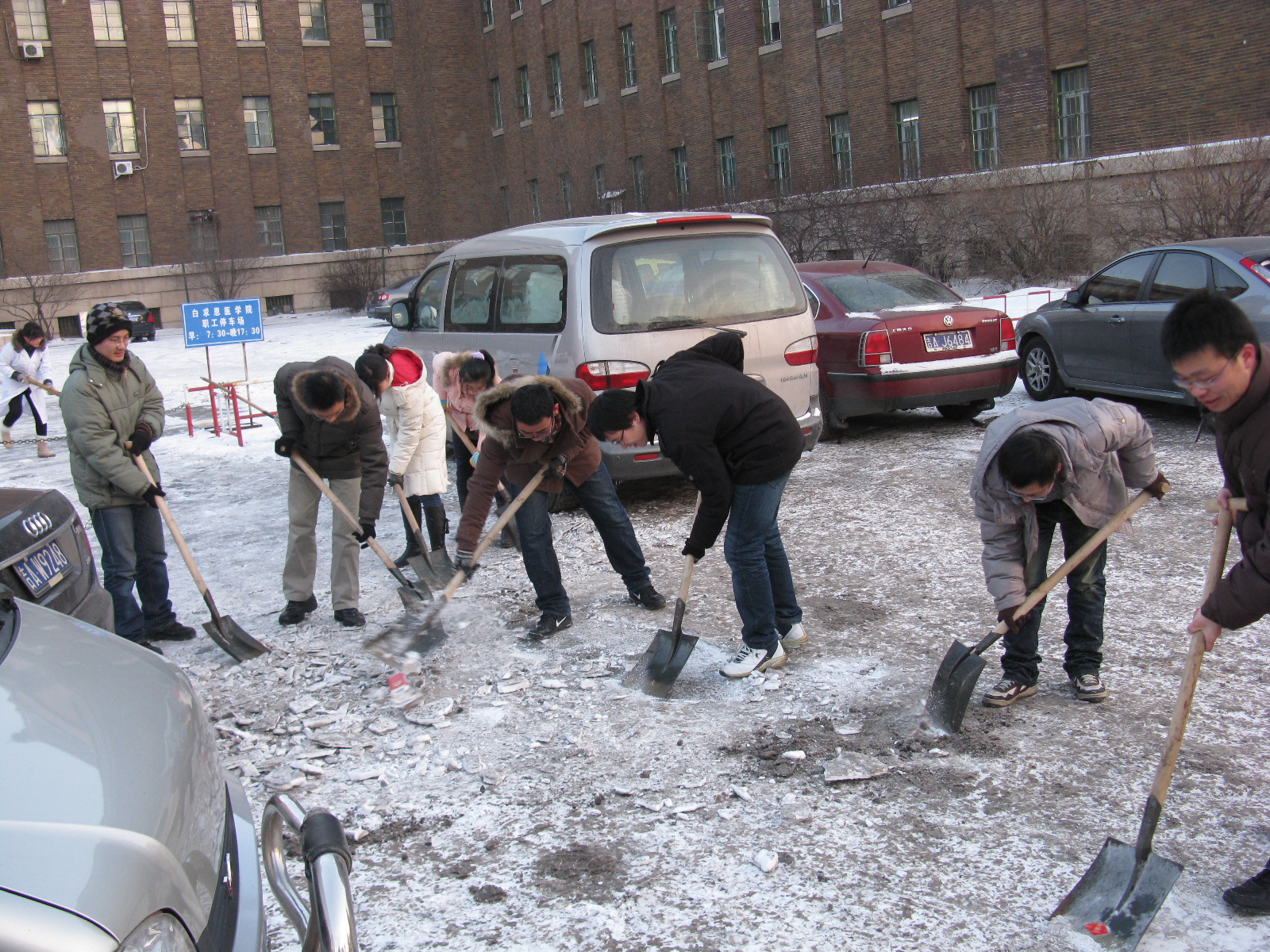 近日,大雪过后,基础楼前再度出现冰雪路面,师生走过,危险重重。为给师生创造一个安全的环境,白求恩医学院2009级硕士研究生党支部在2010级硕士研究生党支部手中接过了“爱心接力棒”,在基础楼门前继续开展了义务清雪活动。由于当时温差较大,一部分积雪融化后结冰,增加了扫雪除冰的难度,但是同学们积极克服困难,经过一个多小时的浴“雪”奋战,冰和雪的路面中间出现了一条柏油小路。同学们看着自己的劳动成果,想着师生可以安全行走在这条小路上,倍感欣慰。